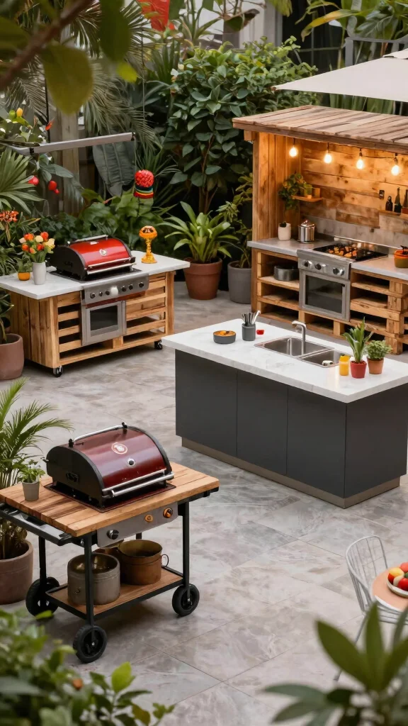 The unique aesthetic adds warmth to your patio, and you can customize it to reflect your personality. For added functionality, include a sturdy worktop for prep and a shelf for your tools. Adding wheels can make it mobile, and a small herb garden can elevate the design.