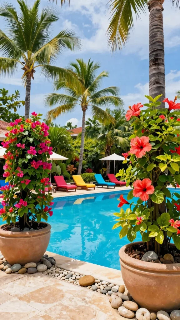 – Create a Tropical Oasis with lush palms and vibrant plants to establish a relaxing, vacation-like feel around your pool area.