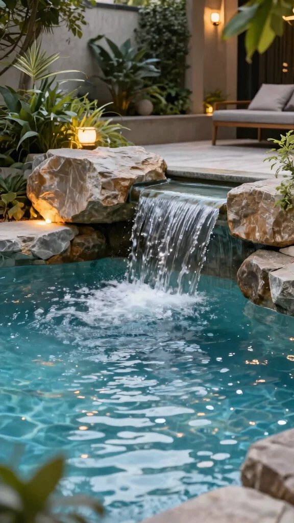 Consider designing a small waterfall that cascades into the pool or incorporating a decorative fountain as a central feature. You can also add LED lights to illuminate these features during evening gatherings, making them truly stand out.