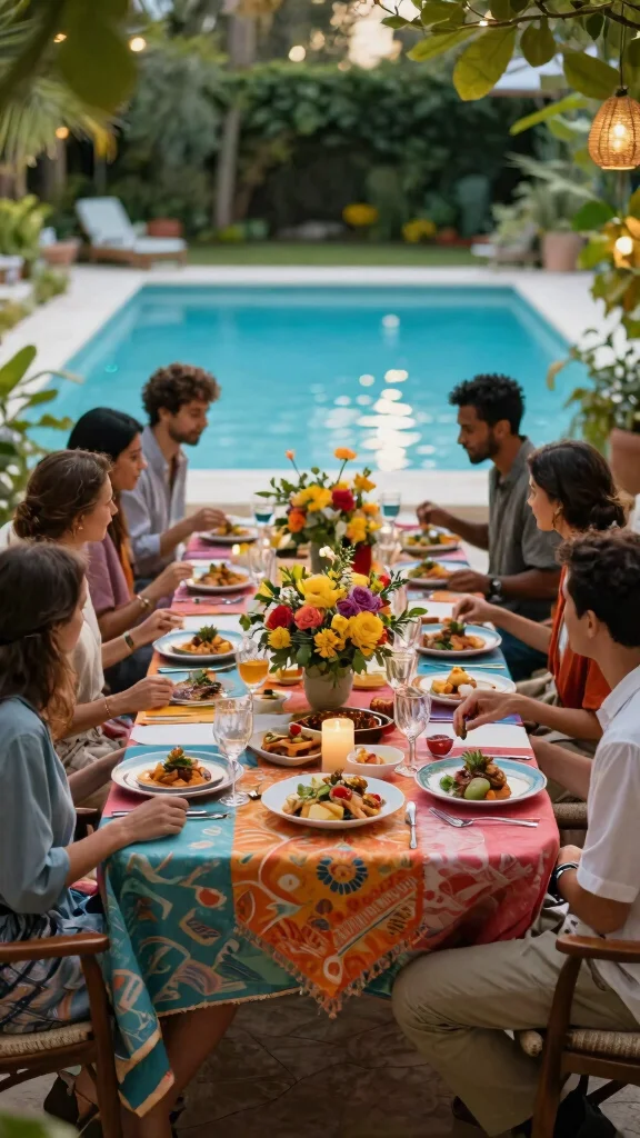 Fact: A vibrant pool area dining setup can boost guest enjoyment by up to 30%. Set a spacious table with colorful tableware, fresh flowers, and seasonal dishes, then add a simple runner to tie it together. Your meals become memories in minutes.