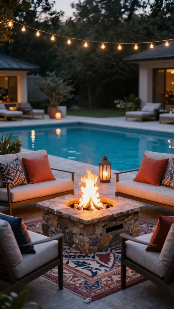 Craft a warm and inviting space by adding a fire pit to your pool area. This feature not only provides warmth but also serves as a central gathering point for evening relaxation and socializing. Imagine friends sharing stories and sipping drinks as the fire crackles under the stars.
