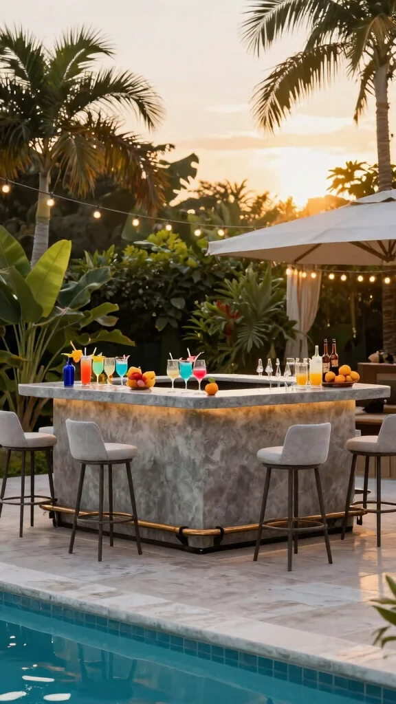 Select weather-resistant materials like metal, wood, or stone to ensure durability. Stock it with essentials like ice, mixers, and garnishes, and add bar stools or high-top tables to encourage socializing.