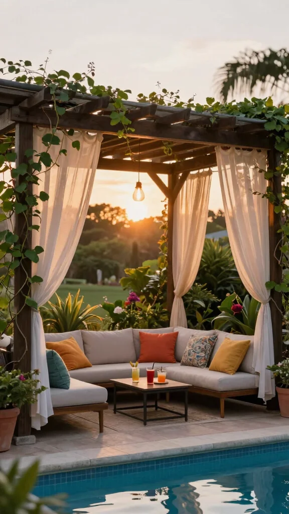 A well-placed pergola turns a pool area into a true outdoor retreat. Add climbing vines and sheer curtains for privacy and charm, and you’ll enjoy shade, airflow, and cozy seating from morning to sunset.