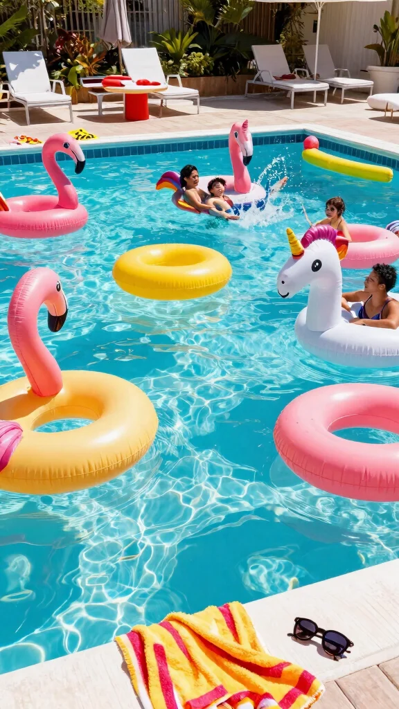 Incorporate a variety of sizes and styles to cater to guests of all ages. Create a designated area for floats near the pool for easy access, or set up a float station to encourage guests to choose their favorites throughout the day.