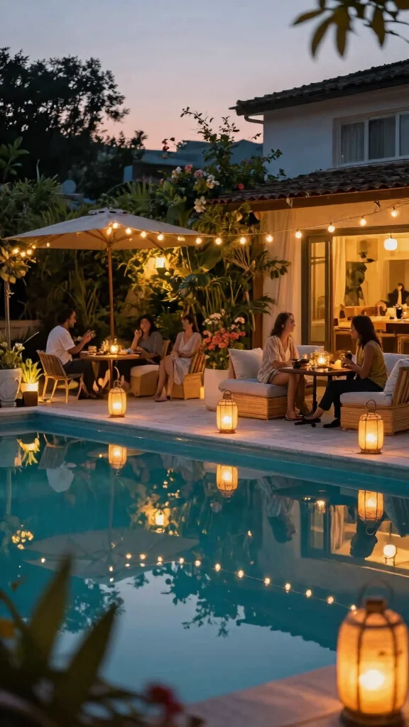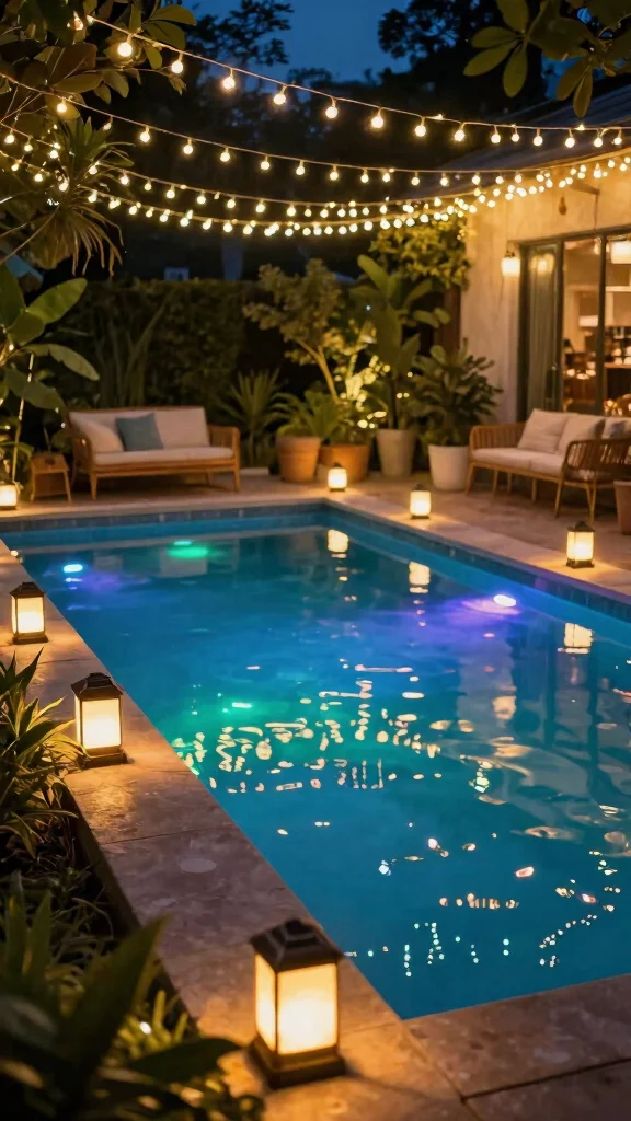 Hang string lights above the pool area to create a twinkling effect, and place solar-powered lanterns strategically to provide a soft glow. Consider adding underwater LED lights in the pool for an eye-catching visual experience during evening events.