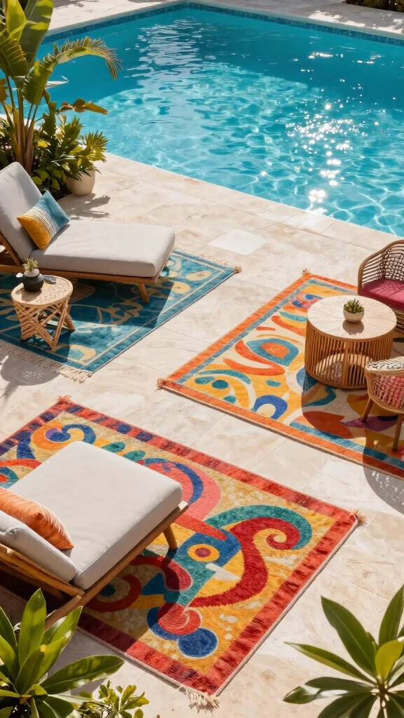 Select rugs made from weather-resistant materials that are easy to clean, and choose vibrant colors or patterns that match your style. Layering rugs can add texture and depth, making your poolside feel like a true extension of your home.
