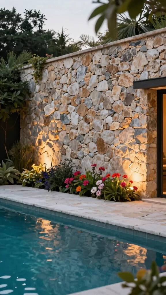 Use stone wall fencing for a natural elegance that provides privacy and a robust barrier around your pool.