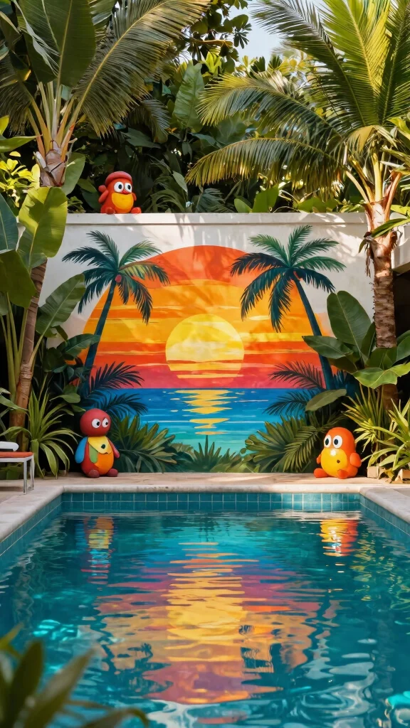 Personalize your outdoor space with creative poolside art that reflects your unique style. Artistic pieces can elevate your garden’s aesthetic, transforming it into a captivating environment. Consider hanging tropical-themed wall art or murals on nearby fences, or incorporating sculptures that complement your overall vibe.