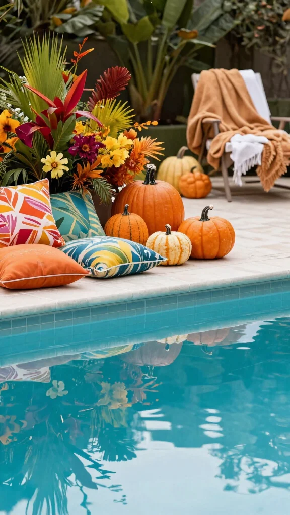 Keep your pool area feeling fresh and exciting by changing your decor with the seasons. This practice not only rejuvenates your outdoor space but also reflects the beauty of nature throughout the year. In spring and summer, opt for vibrant colors and tropical prints, while fall calls for warm tones and autumn foliage.