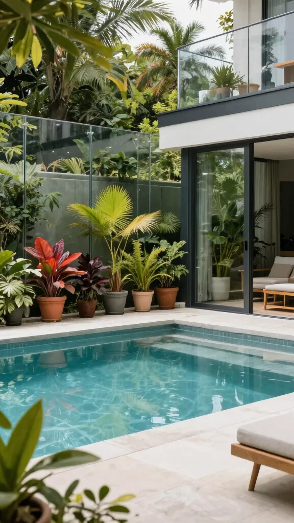 Use tropical plants that thrive in humidity (palms, hibiscus, bird of paradise) in pool-safe planters made of teak or stone.