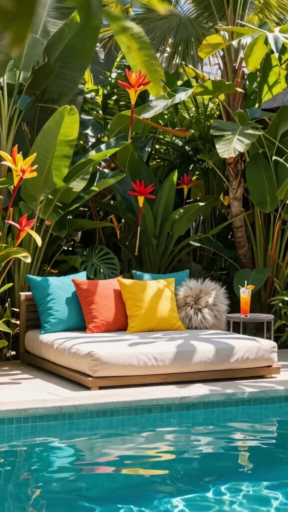 Introduce vibrant outdoor rugs to add comfort and style to your poolside area. These rugs can define spaces while bringing a splash of color to your surroundings. Opt for patterns that reflect your tropical theme, such as palm leaves or bright florals, ensuring they are waterproof and easy to clean.