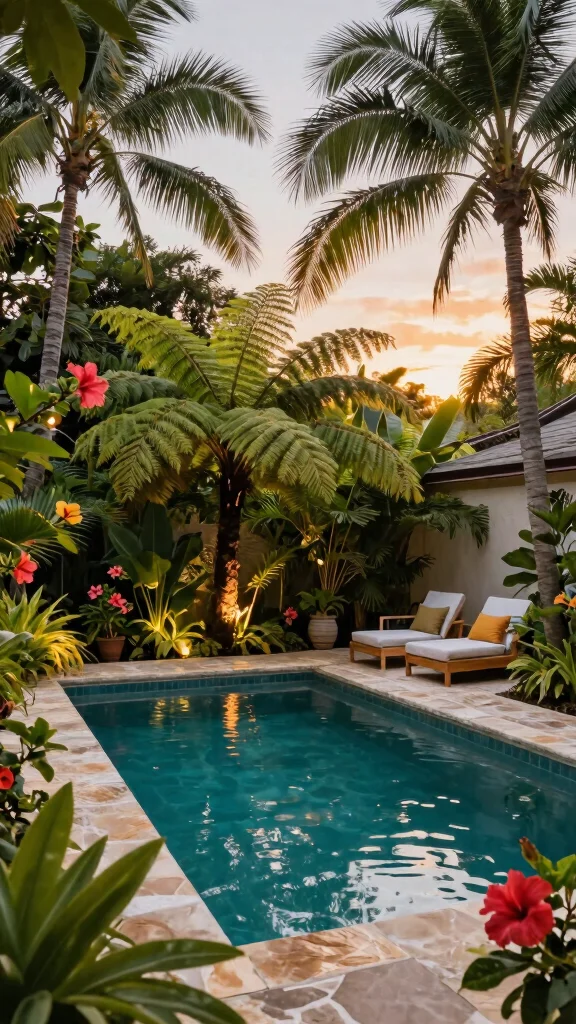 Imagine stepping into your own tropical oasis every time you visit your private pool. By layering lush foliage, you can create a vibrant escape filled with the soothing sounds of nature. Opt for plants like palm trees, hibiscus, and ferns to craft a rich, colorful backdrop that offers both beauty and privacy. Tall plants around the pool provide a natural barrier, letting you enjoy your space without prying eyes.