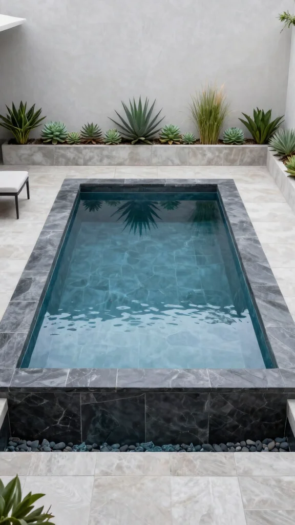 Consider starting with a rectangular pool that boasts clean edges. Stick to neutral colors for the decking and surrounding areas to maintain a streamlined look. Use geometric furniture for consistency and add privacy screens adorned with climbing plants to enhance both seclusion and style.