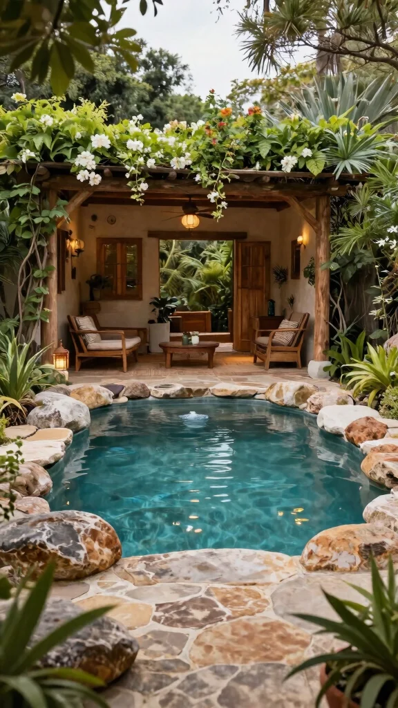 Begin with large stone slabs for the pool decking to achieve a natural aesthetic. Add boulders around the pool for texture and interest, and plant wildflowers or native grasses to enhance that rustic vibe. Consider shaded areas created by wooden pergolas adorned with climbing plants for added comfort.