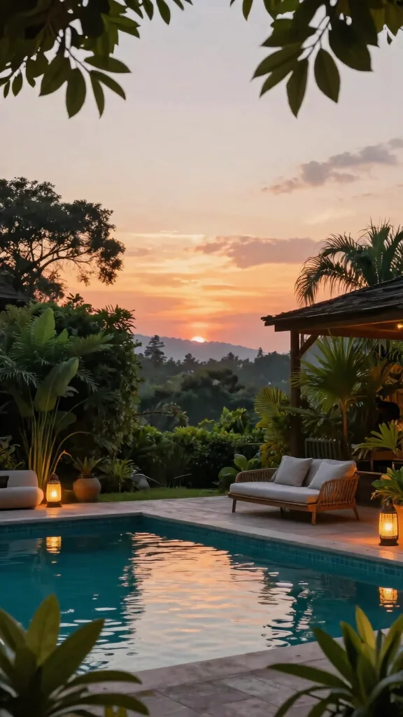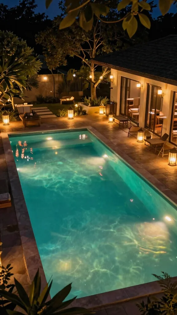 Consider installing submerged LED lights in the pool for a captivating glow. Use solar-powered lights along pathways for eco-friendly illumination, and hang lanterns in trees to create a warm vibe. Dimmable lighting options can help you customize the brightness to suit the moment.