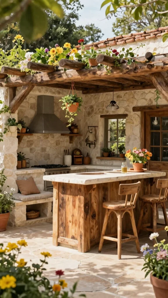 Craving a cozy atmosphere that feels like a retreat? A rustic stone and wood blend in your semi outdoor kitchen provides warmth and charm. The natural textures of stone paired with reclaimed wood create an inviting space that’s both beautiful and functional. Imagine hosting friends while enjoying the durability and low maintenance of these materials, all while soaking in the surrounding nature’s beauty.