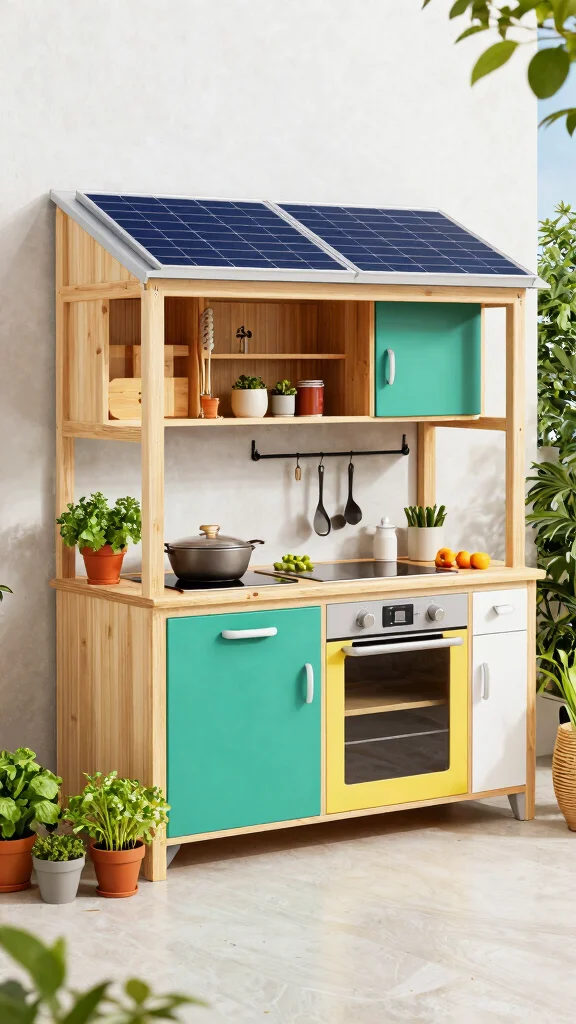Opt for countertops and cabinets made from recycled materials, and arrange movable sections to fit your needs. Consider incorporating solar panels for energy-efficient lighting and appliances. With a modular kitchen, you can easily adapt to your gardening and cooking requirements, all while enjoying a stylish and efficient outdoor experience.