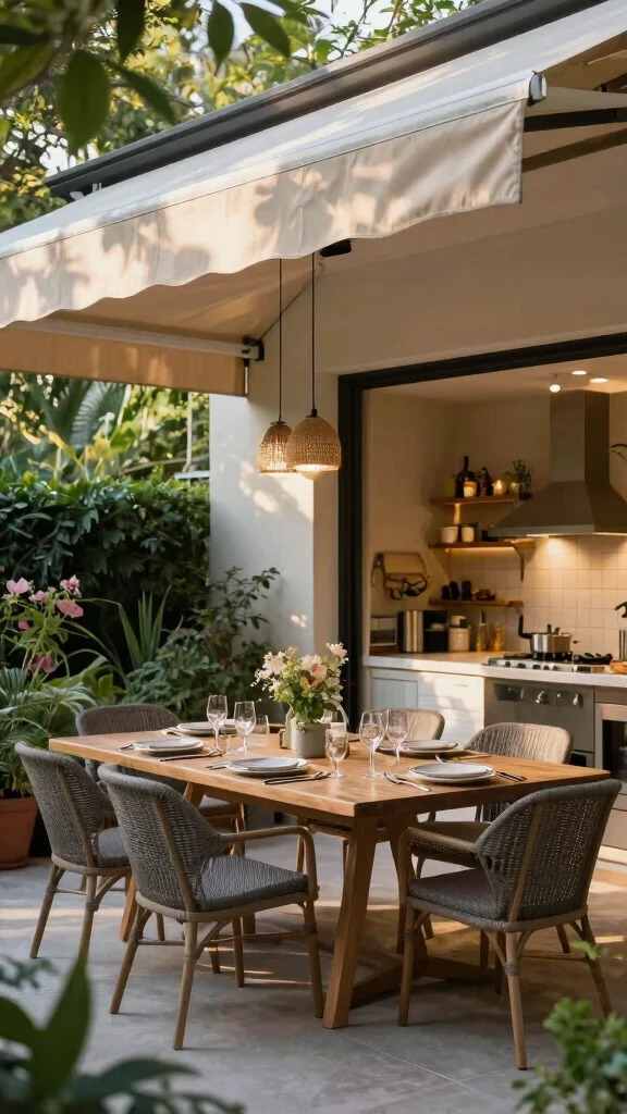 Use retractable awnings to adjust coverage based on the weather, and incorporate stylish ambient lighting for a warm atmosphere after dark. Enhance the aesthetic with plants or draping vines. This elegant setup not only makes meals more inviting but also encourages gatherings with family and friends, allowing you to savor the outdoors no matter the conditions.