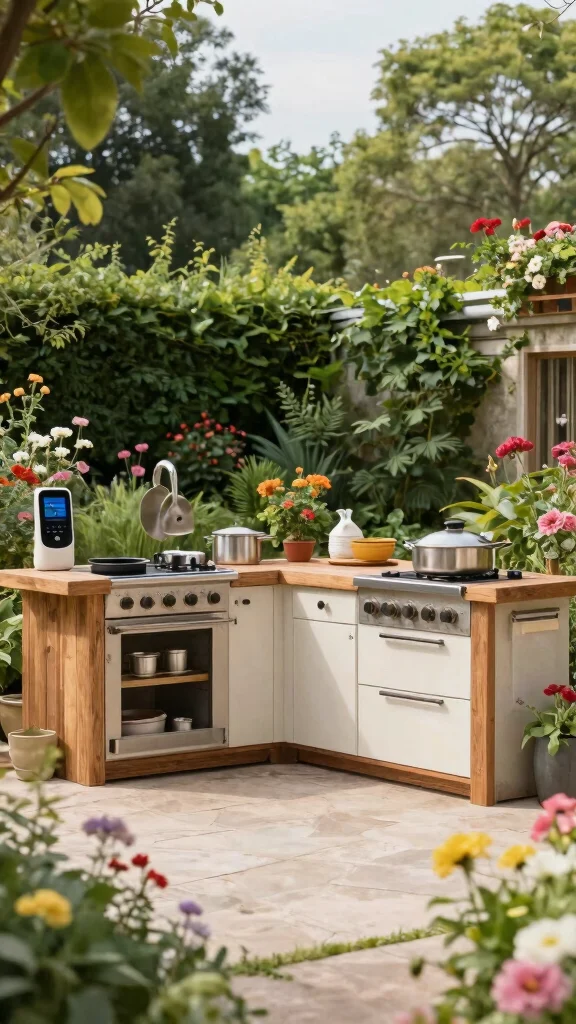 Think IP-rated appliances, smart lighting, and a central control hub. Weatherproof elements include outdoor-rated outlets, ventilation fans, and sealed cabinets. Add a Wi-Fi grill thermometer, smart irrigation for nearby herbs, solar charging, and energy-efficient appliances to reduce running costs.