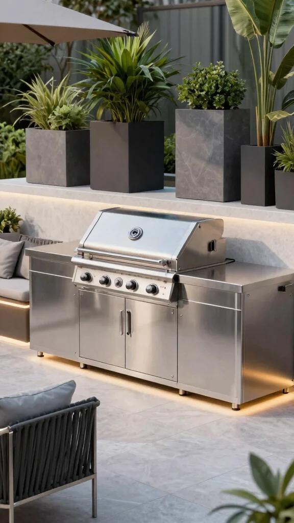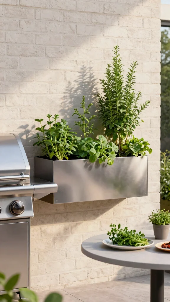 Create a minimalist grill area with integrated garden features for a compact and inviting outdoor space.