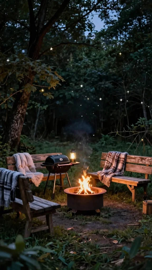 Think about pairing a small portable grill with a compact fire pit that allows for seating all around. Using wooden benches or rustic stools enhances the homey feel, and adding string lights or lanterns brings warmth to your evening meals.