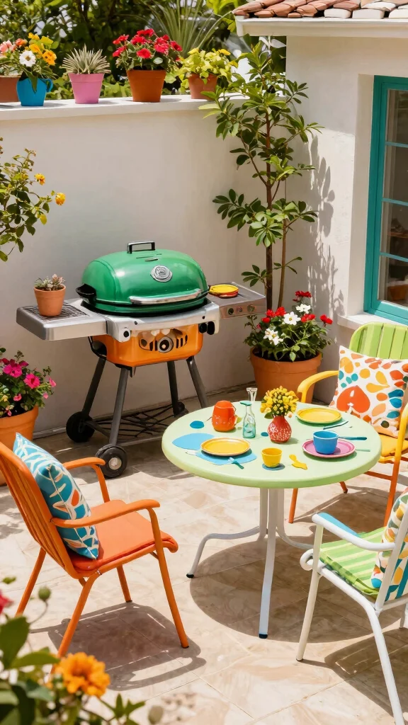 Choose a lightweight grill that’s easy to maneuver, and team it up with a small round bistro table and two delightful chairs. Add some twinkling string lights overhead and a potted plant for a touch of color, making every meal feel special and memorable.