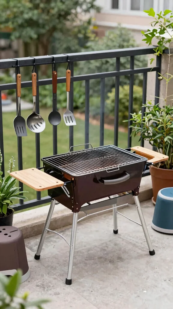 Use compact grill designs with fold-down surfaces and wall-mounted shelves to free floor space. Add a narrow prep table, a small cooler, and vertical herb planters to keep ingredients within reach.